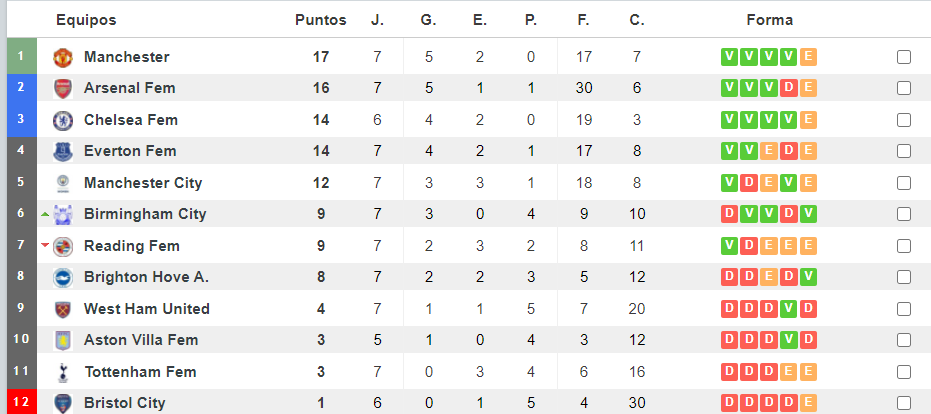 La única posición de Champions League la ocupa el Manchester United con 17 puntos, en los dos puestos de previa para Champions están el Arsenal con 16 puntos y el Chelsea con 14 puntos.